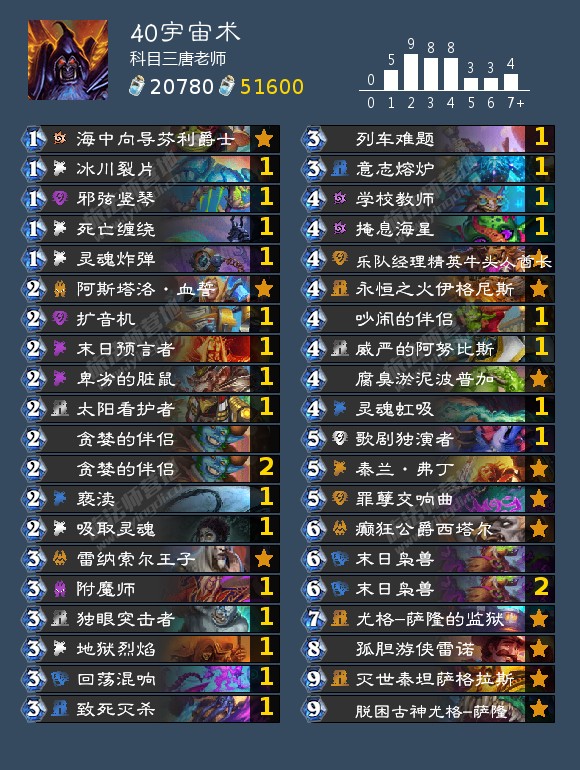 大家好,我是科目三唐老师#3162(亚服),一名标准术士玩家。新补丁以来,我自己改良了一套宇宙术,在当前这个德贼横行的环境下,还能有不错的一战之力。月初上传后,目前以60%+的胜率在传说1000名左右划水(由于很多局在手机上玩的,没法贴数据啦)。本来我人也很懒,从没发过帖,但今天迷你包的消息出来还是刺激了我。。由于新卡出来后环境必然剧变,这套卡组也就失去了意义,因此还是决定跟大家分享一下,至少让它能短暂的在营地上停留一阵。。下面先上卡组(牛牛里是拍照、软、机器人):