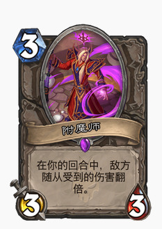 一次偶然的尝试,让我发现附魔师这张卡竟然和术士的宇宙体系如此契合。由于术士很多解牌都是带回血效果,因此配合上此卡可以加强解场的同时增强回血。想想它和吸取灵魂、致死灭杀、腐臭淤泥波普加等卡的配合,在附魔师在场时,这些卡效果就变成了打6回6、打10回X、打16回16(前提是打到怪上),和地狱烈焰配合则变成全场a6,和亵渎配合变成打2的亵渎,等等。虽然它在配合一次后很有可能就被对方解掉,但关键回合它提供的解场\回血能力让它在我卡组里无可替代。