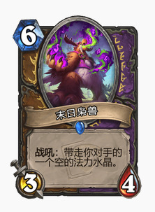 在我看来,宇宙术一直以来难与主流卡组抗衡的原因之一就是节奏上一直落后,经常处于疲于解场的境地。而末日枭兽一张牌,就能让敌我之间的节奏形势在中期出现逆转,打快攻时让对面攻势大大放缓,打慢速时能及时让自己掌握场面主动权。为了尽早发挥费用压制的优势,我们再利用贪婪的伴侣带来的硬币,提早回合数来拍下末日枭兽,完成跳费combo。如果后手手顺时,最快4费就能抢对手水晶,在双方都10费前牢牢地把握住场上形势。因此,在绝大多数对局时,都可以把牌全换掉来找这两张牌。只要撑过了前中期,后面依靠灭世泰坦萨格拉斯、永恒之火伊格尼斯、罪孽交响曲等卡牌就能锁定胜局。
