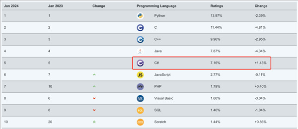 TIOBE公布的数据显示,C#在2023年的涨幅达到了1.43%,远超过竞争对手Scratch的0.83%和Fortran的0.64%。