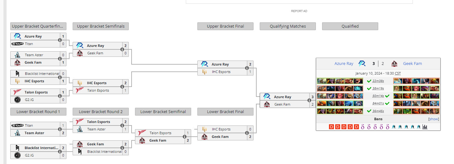 Geek一级团大获全胜梦幻开局,不过中后期两边都有出色发挥和失误,比赛一直焦灼到了80分钟,AR击杀Geek双酱油后准备给出最后一击,但Geek的小狗背靠世界树3打5创造了奇迹,最终Geek扳平比分。