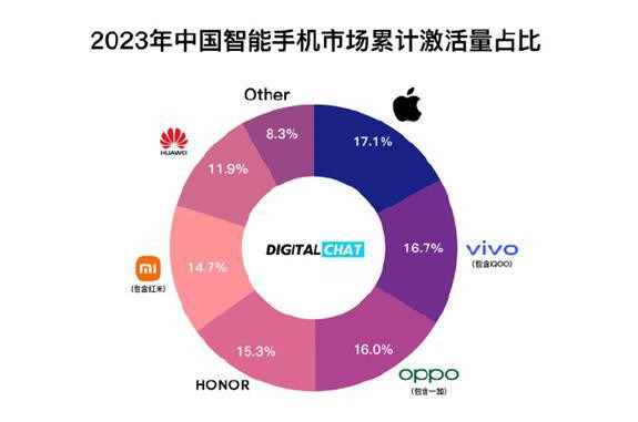 2023年国内份额前六名分别是苹果、vivo、OPPO、荣耀、小米和华为,合计占91.5%。