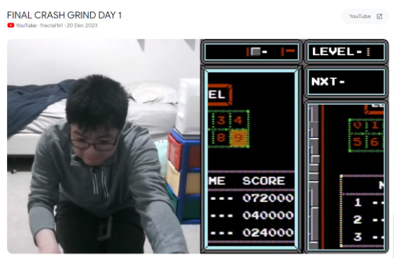 2023 年 12 月 19 日,上届《 NES 俄罗斯方块 》世界冠军( CTWC 冠军 ) Fractal161 开启了一个直播叫 “ FINAL CRASH GRIND DAY 1 ” ,立志于每天冲击高分直到打爆这个游戏。