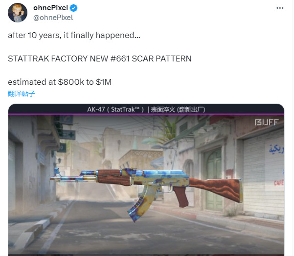 而在推特用户“ohnePixel”的描述中,现在这个崭新出场的皮肤,经了10年才终于面世,市场估计能达到80至100万美元之间。