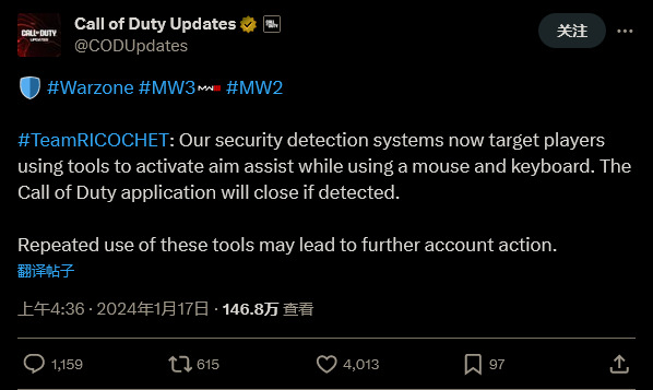 推文写道:“我们的安全监测系统现在针对使用工具激活了瞄准辅助的键鼠玩家,如果检测到,《使命召唤》应用程序将会关闭。如果你继续尝试,情况只会更糟:‘重复使用这些工具可能会导致进一步的账号层面对策。’”