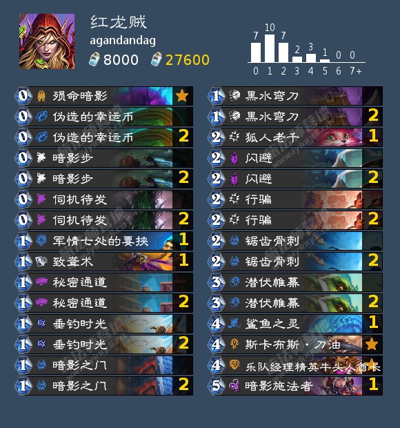 来自agandandag的红龙贼,他使用这套卡组连续多个赛季占据美服前列(偶尔登顶),目前在20+名。