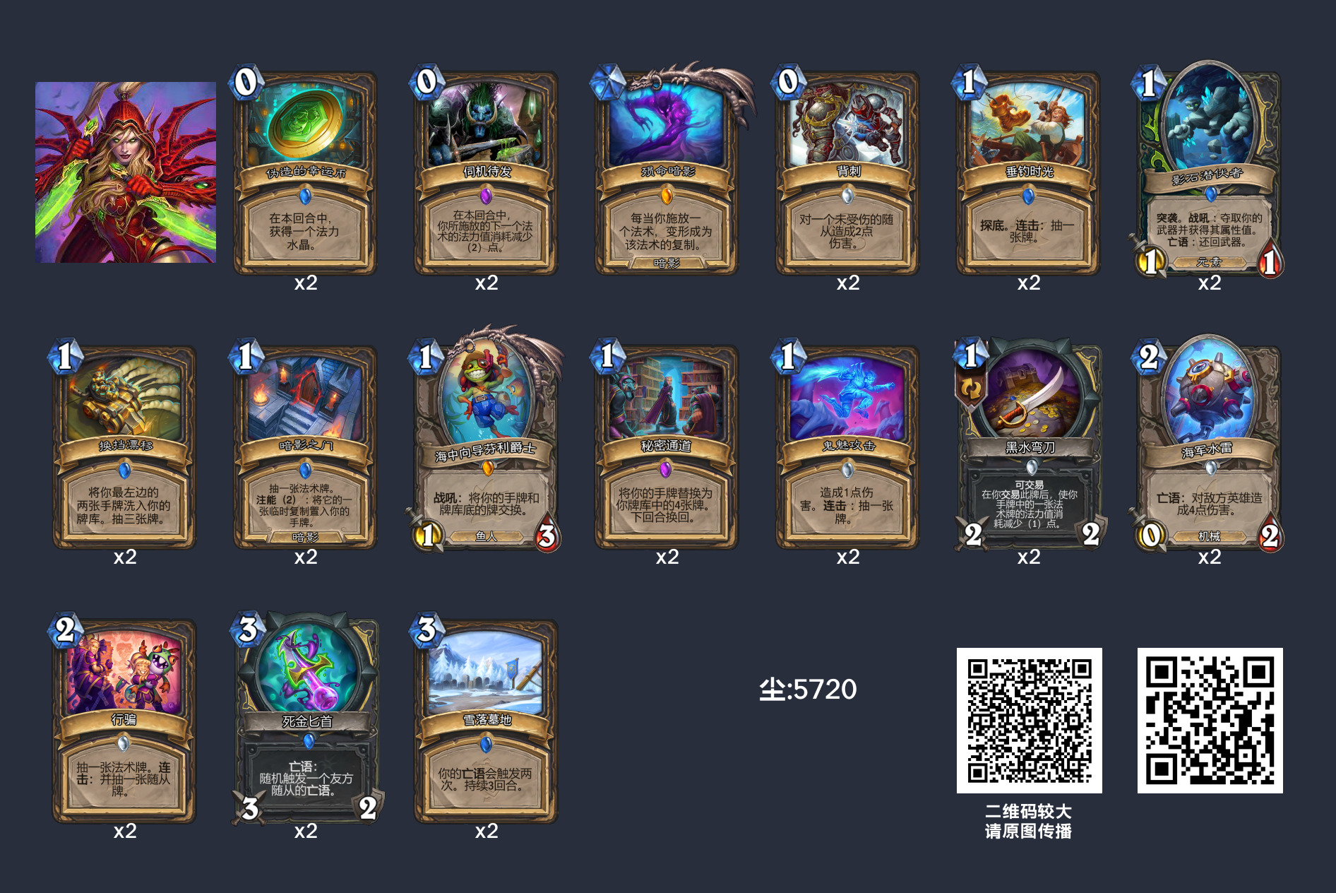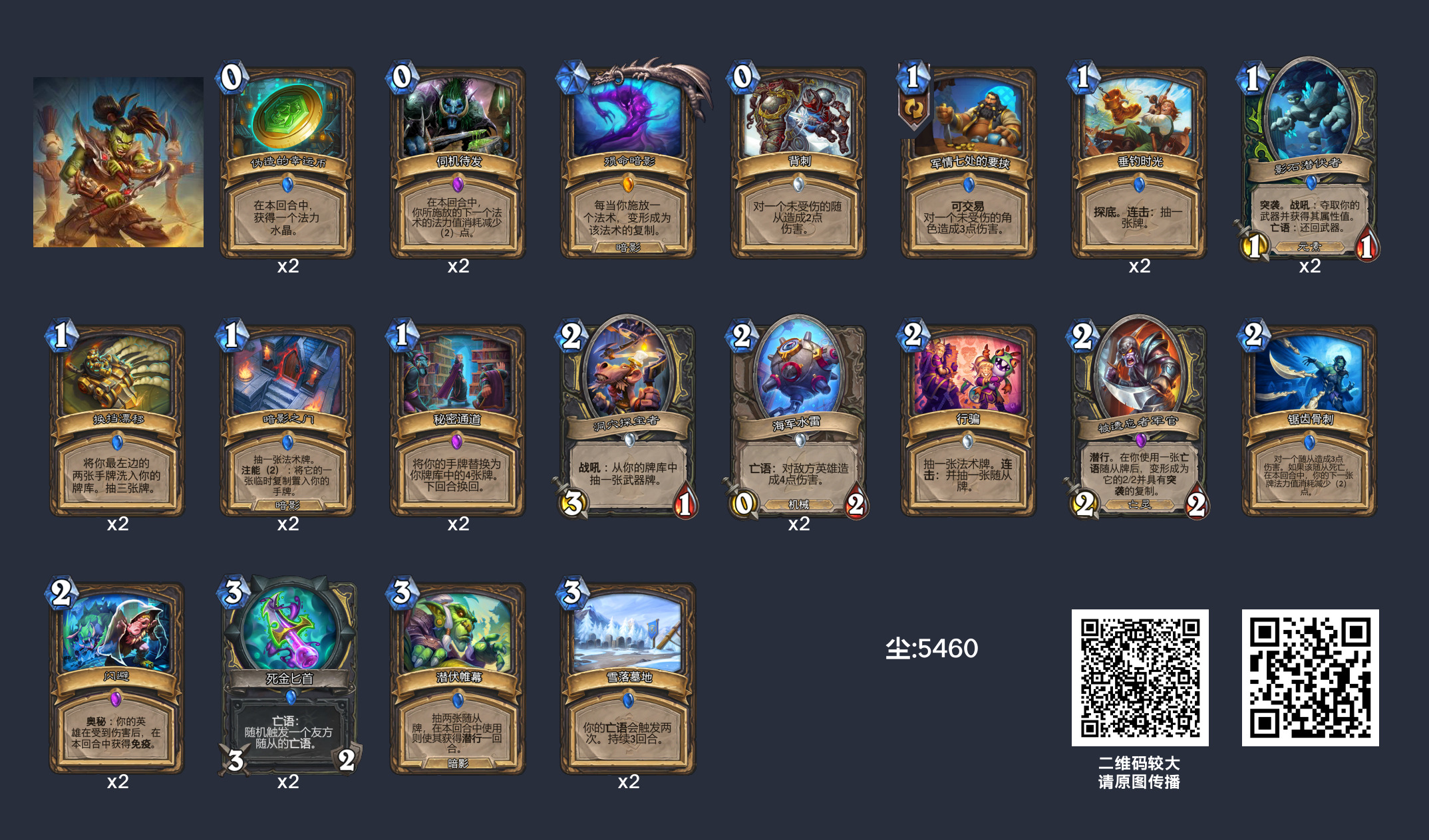 卡组为了提速舍弃了闪避,新卡影石潜伏者能配合雪落墓地和死金匕首轻松打出高额伤害。