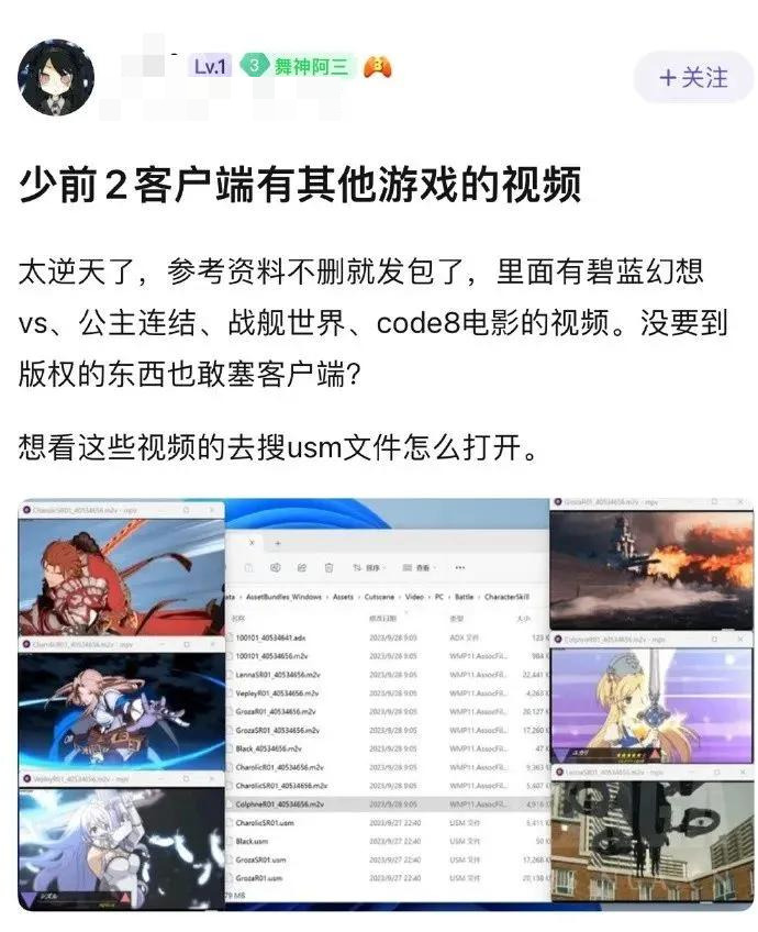 此外,还有网友在《少前2》的pc游戏文件里发现了列如公主连结、碧蓝幻想、战舰世界等其他作品的画面,估计是是制作游戏时参考的素材,但就这样原封不动的放在了用户下载的文件里进行封装,属实是十分难绷。