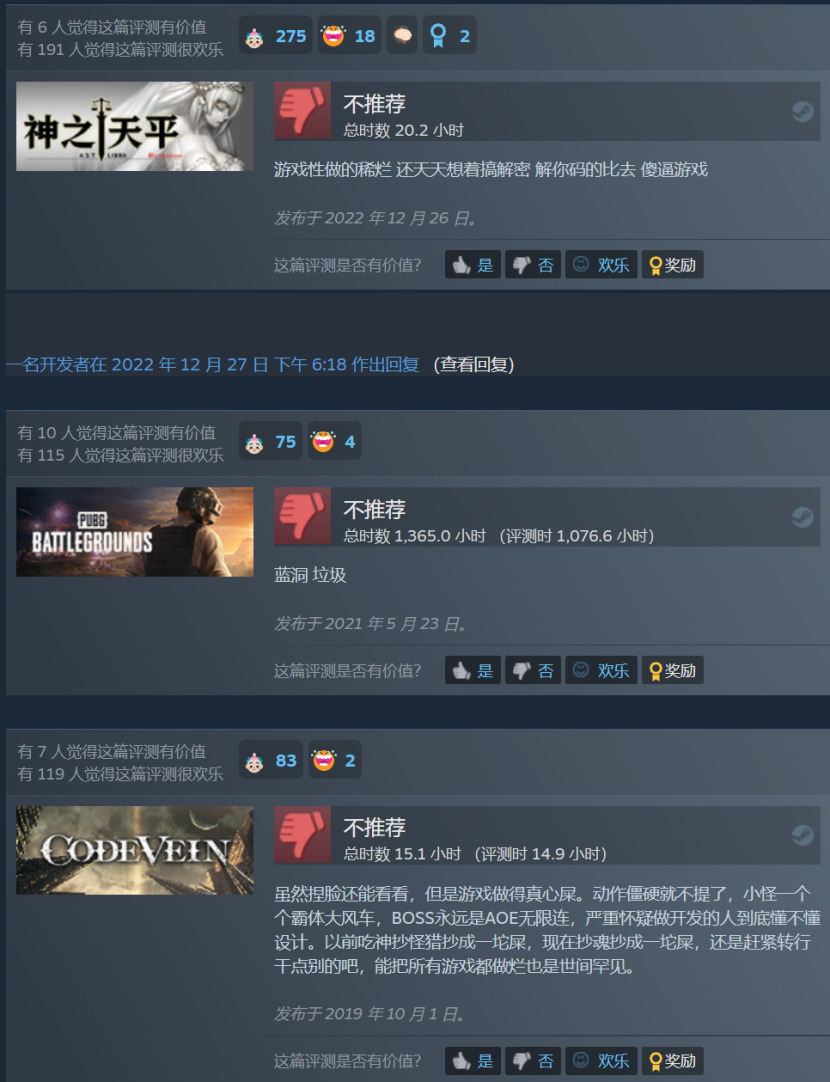 其实这在steam也还算常见,但问题就在与他自己就是一个游戏制作人,不论名声是好是坏,攻击同行的反差感无疑让乐子的好笑程度上升了几个量级。