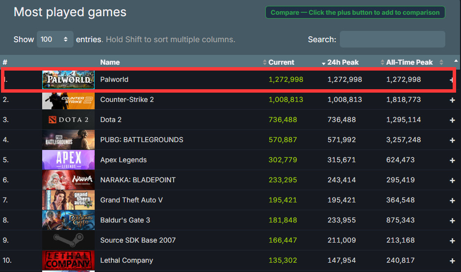 1 月 21 日晚,Steam 上的24小时同时在线人数突破了 120 万,目前暂列 Steam 上在线玩家数量最多的付费游戏第一位,且还在继续创造着新游戏前所未有的记录。