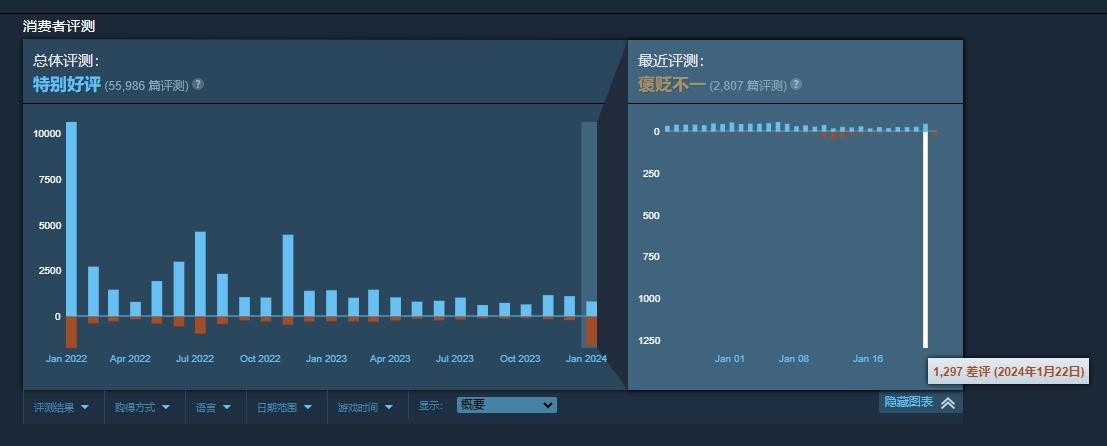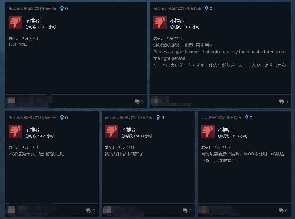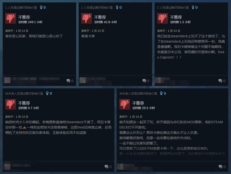 卡普空的这一行为引来了大量玩家声讨,此前有报道称Enigma加密不仅仅是反盗版反作弊,还会阻止玩家安装Mos,影响游戏帧率,导致游戏卡顿。目前《怪物猎人:崛起》的Steam最近评测已降为“褒贬不一”,好评率41%,仅22号更新当天游戏就收到了近1300个差评。
