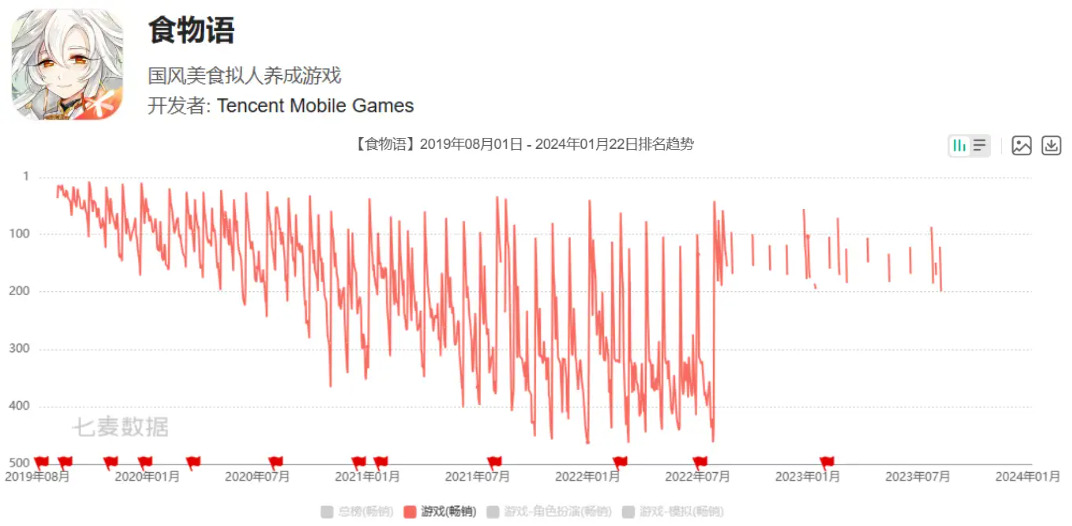 《食物语》是广州百田开发、腾讯发行的国风乙女游戏,食物拟人化是其最大的特色。根据官方数据,《食物语》在2019年上线首月流水就突破亿元。之后的运营走势也比较稳定,直到2022年9月才逐渐掉出iOS畅销榜前500名。