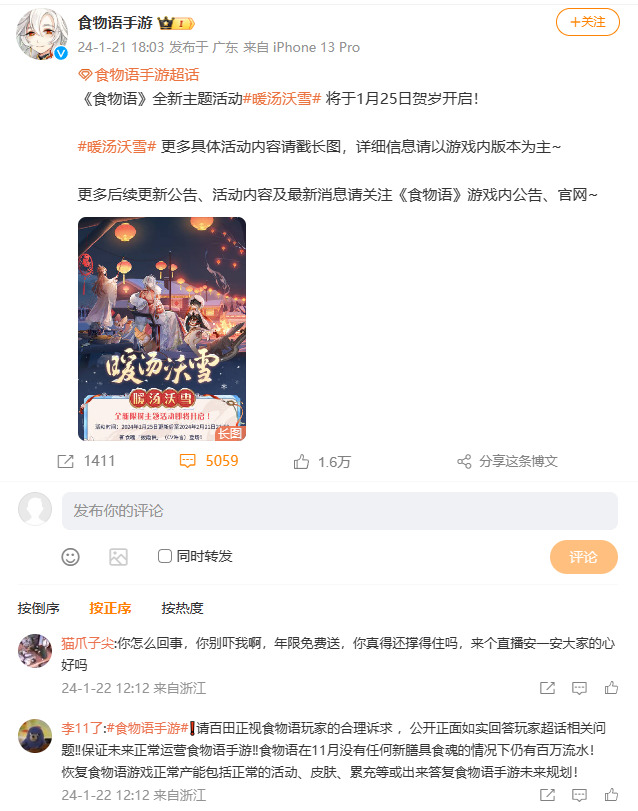 1月20日,《食物语》发布了2024年的首个版本PV「暖汤沃雪」。同步的版本活动突出一个「送」字,年度限定角色、时装及道具都能通过登录领取或者参加活动免费兑换。不过面对丰厚福利,评论区却是一面倒的悲观情绪。