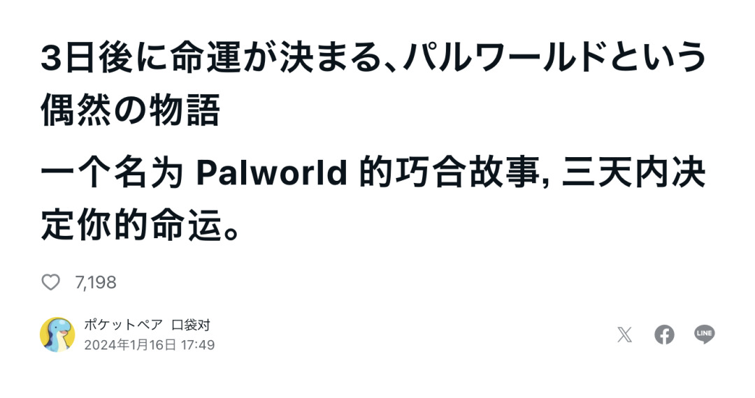 幻兽帕鲁能有现在的成绩,就连 Pocket Pair 社长溝部拓郎也纳闷,用他在 note 网站上写的长文来概括:这玩意就是个奇迹啊。