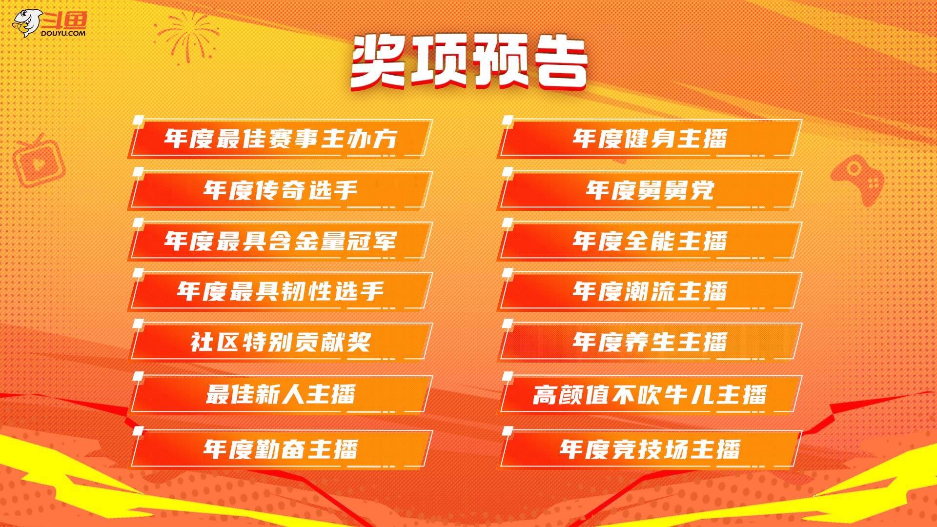 【年度健身主播】、【年度传奇选手】、【最具含金量冠军】、【年度养生主播】、【高颜值不吹牛儿主播】等等“重磅“奖项将花落谁家?斗鱼年度“暴”梗大会等你揭晓!