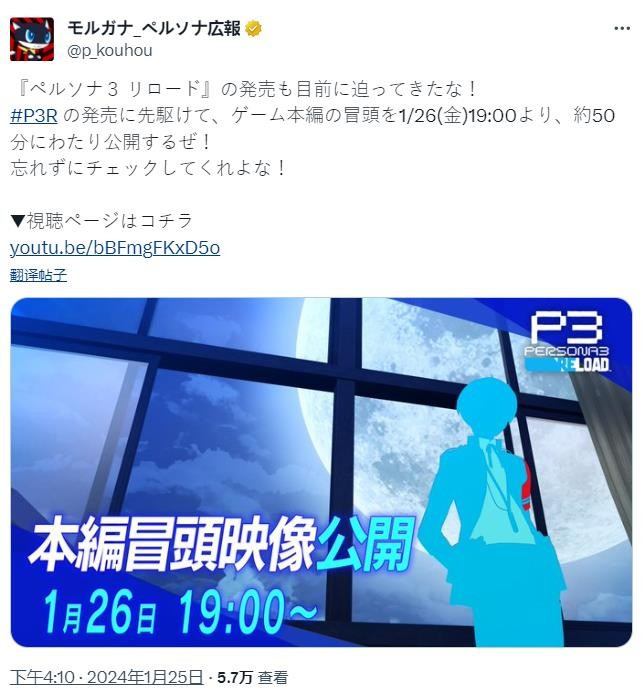 根据《女神异闻录》系列X(推特)的消息,官方将于北京时间1月26日18:00公布《女神异闻录3:Reload》开场50分钟的实机游玩画面。