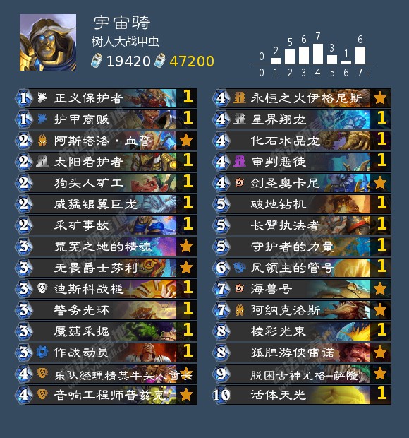 1.挖宝体系:圣骑的四宝刚出的时候我感觉很强,但是由于圣骑在当前版本整体偏快,所以并没有四宝发挥的空间,我当时认为四宝应该是给中慢速的骑士出的,所以在宇宙骑中加入了挖宝体系。挖宝体系我携带了211,565,魔菇采掘和水晶龙,新芬利,其中水晶龙我认为不够稳定,不过为了保证能够挖出四宝还是携带了,并且可以作为一张稀有的低费曲线,可以把水晶龙放在牛里。四宝我认为和洛瑟玛塞隆是基本可以相互替代的关系,所以我放弃了宇宙骑原本会带的洛瑟玛塞隆,转而携带挖宝体系。