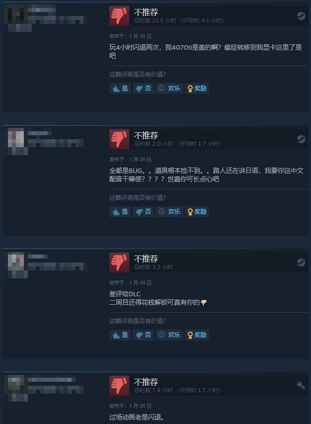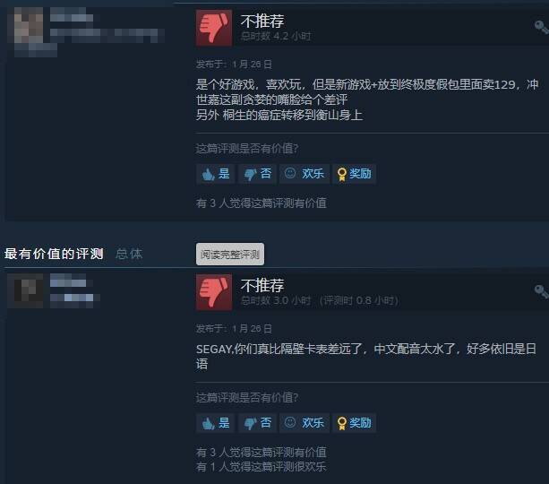 给出差评玩家认为《如龙8》售价有点贵,游戏有闪退和大量Bug问题,中文配音不够好,收费DLC吃相太难看了。