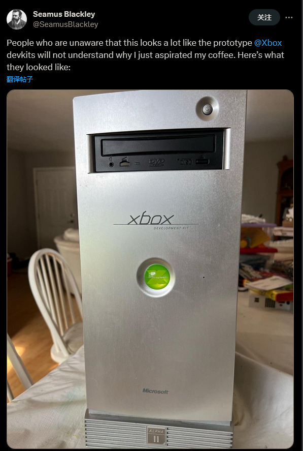 他引用了这篇推文,并写道:“那些不知道这看起来多像一个 Xbox 原型开发机的人不会理解为啥我刚才把咖啡喷了出来。它们是长这样的:”随后他分享了一张原型开发机的照片。