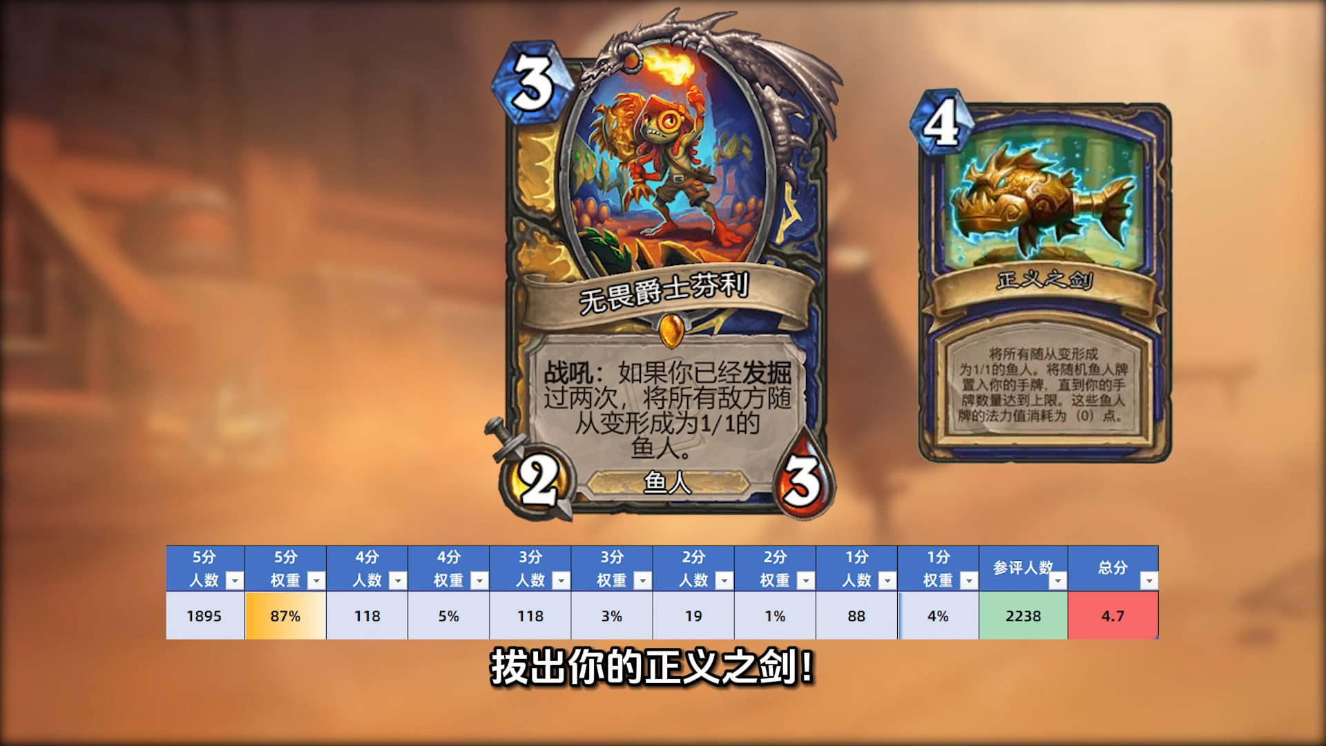 最后一天公布的压轴新卡,全部38张卡中5分好评最多的单卡,穿越回来的小鱼人,拔出你的正义之剑!综合评分4.7