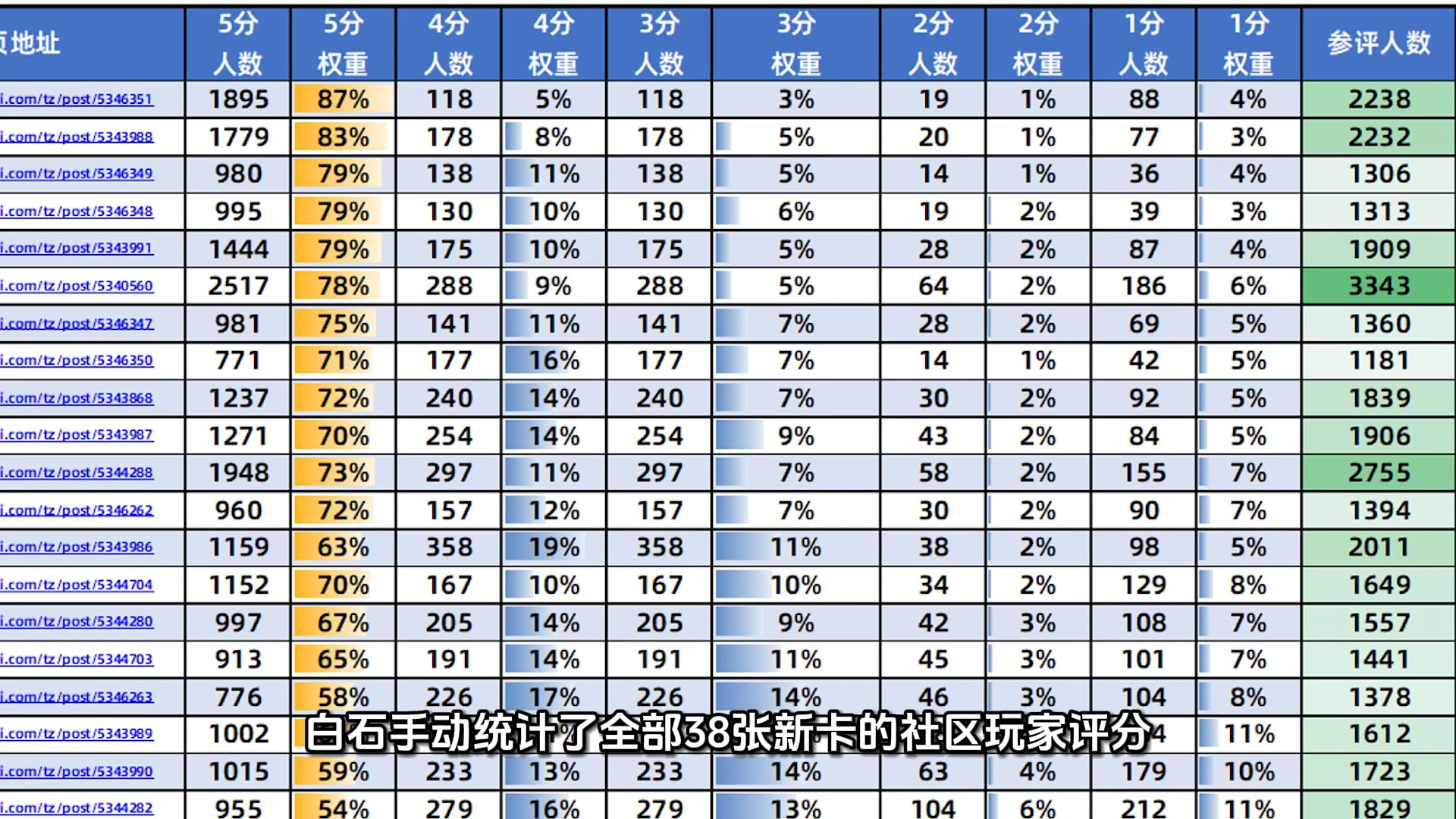 白石手动统计了营地全部38张新卡的玩家投票情况,并按照不同分值打分人数的多少计算权重,综合测算出最终的评分,满分5分,最低1分,我们来看看都是哪些卡牌被吹上神坛,又是哪些卡牌最招人嫌弃吧。数据收集整理不易,求各位彦祖顺手给视频点个赞。
