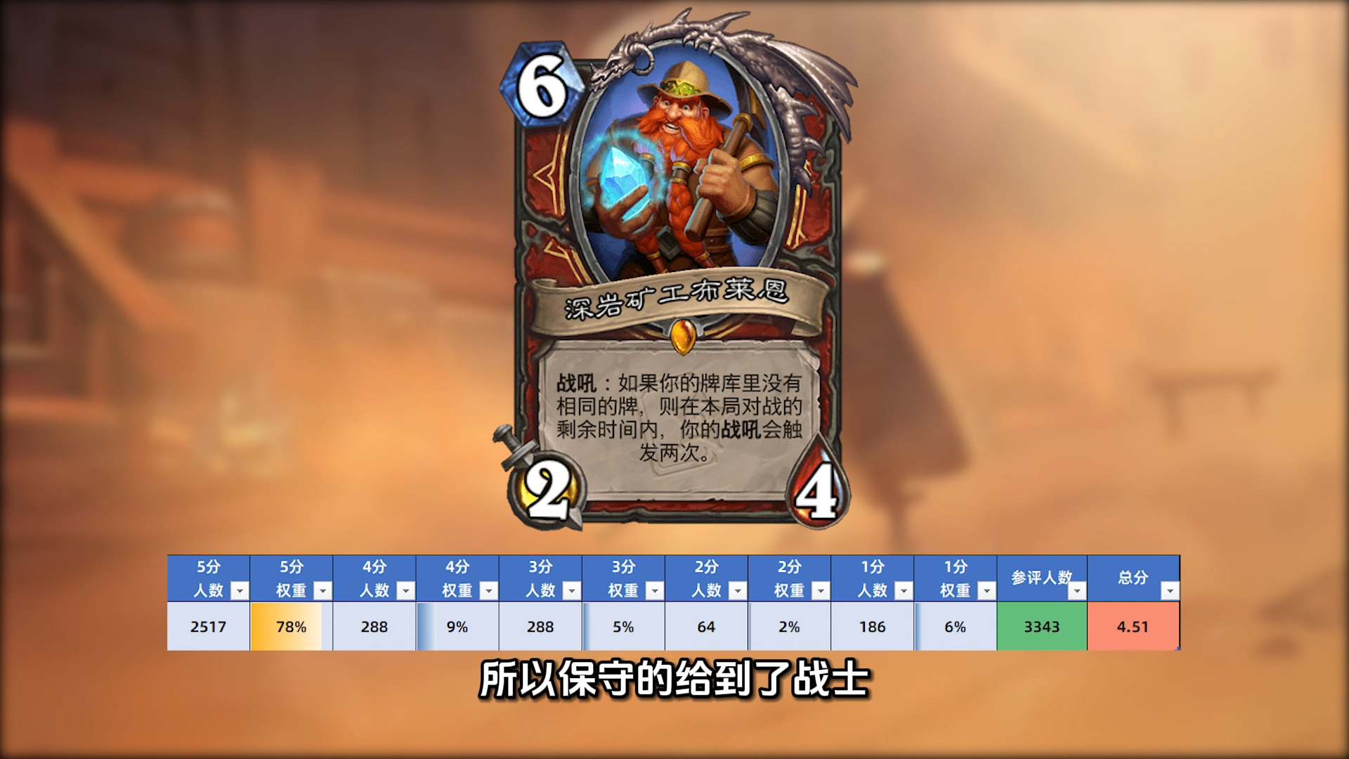 迷你包新卡的话题度担当,冷饭硬炒又强度炸裂,所以保守的给到了战士,3300+玩家参与打分,78%的人给出满分,综合评分4.51