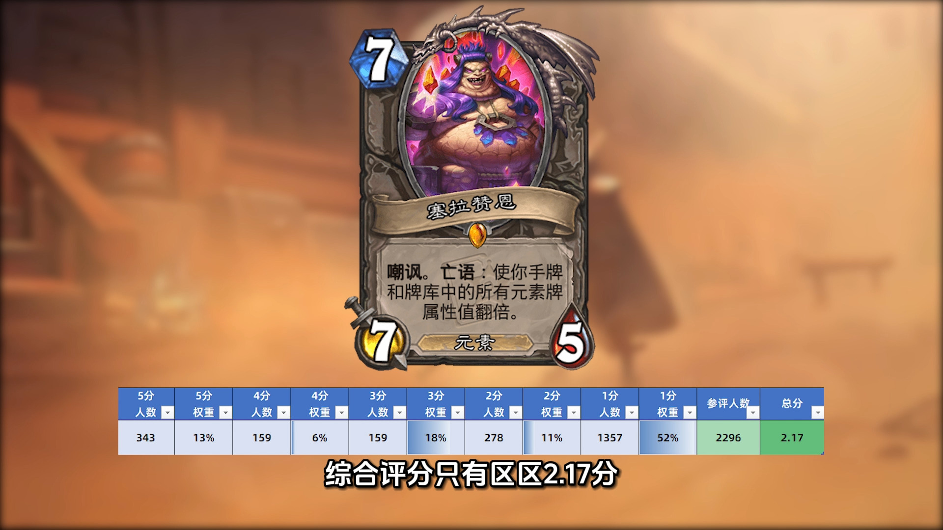 超过80%的玩家给出了3分及以下的评价,综合评分只有区区2.17分,没想到首次登场的石母塞拉赞恩居然是最拉胯的新卡!好歹人家也是版本主题深延之洲的关底boss啊,设计师怎么就给设计的这么没有牌面?怎么着冲着cos嘉伟的外形,也得给点感情分啊!