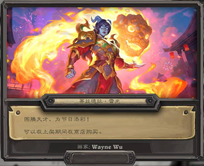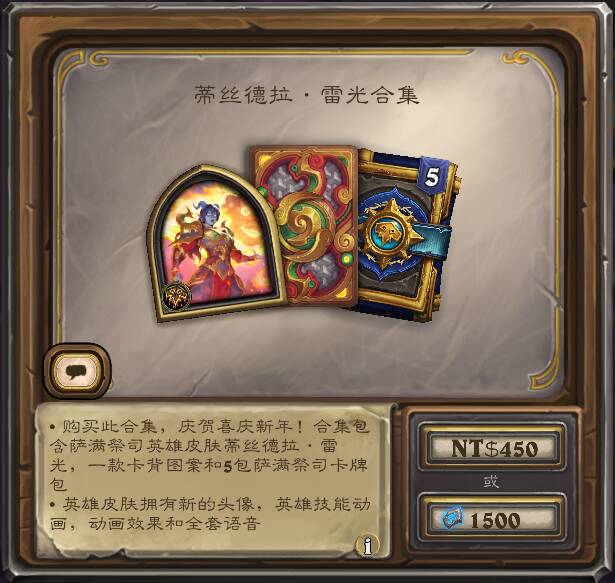 含构筑模式萨满新皮肤“蒂丝德拉·雷光”及配套卡背,和5萨满包,售价1500符文石。