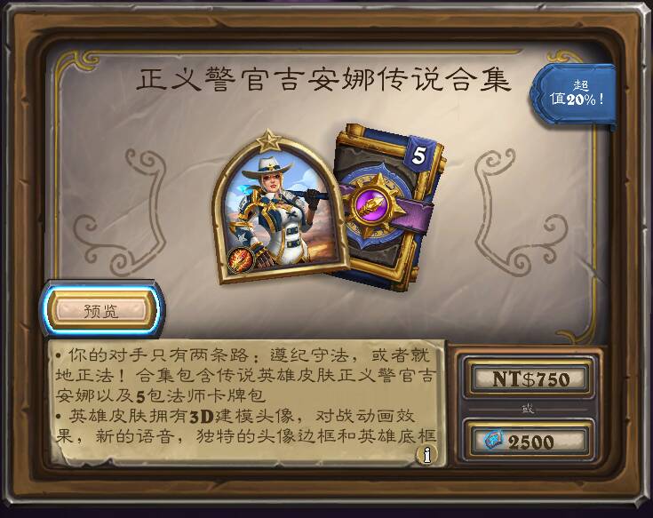 含构筑模式法师(传说级)新皮肤“正义警官吉安娜”和5法师包,售价2500符文石。