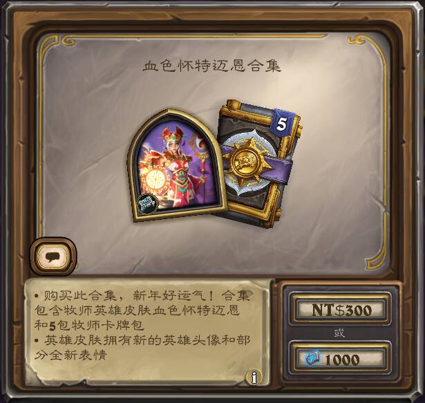 含构筑模式牧师新皮肤“血色怀特迈恩”和5牧师包,售价1000符文石。