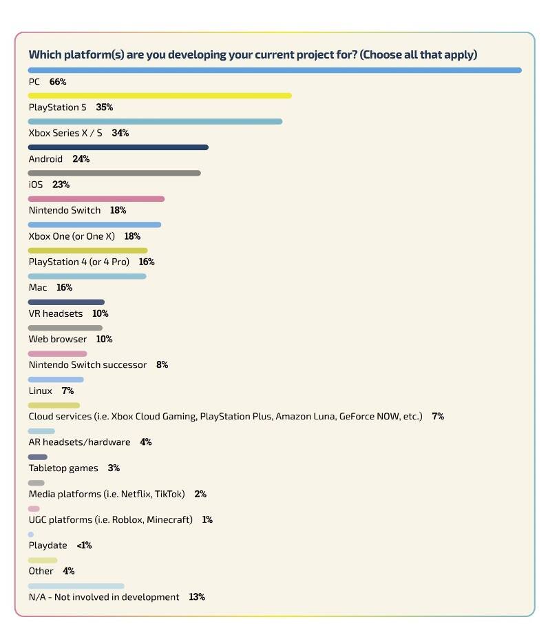 在报告中,询问了超过3000名游戏开发者关于他们的工作和行业的情况。其中有一个问题是关于他们目前的项目开发平台的选择。其中8%的开发者表示他们的游戏是为Switch的继任机而开发的,而18%则表示他们正在与Switch合作。