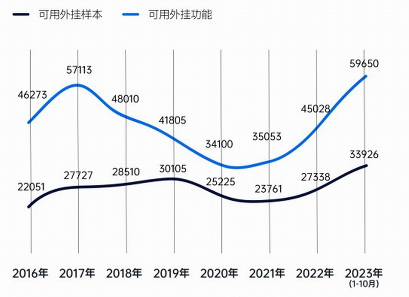 外挂功能数按月均值更是达到了5965款,同比2022年月均3752款增长59%。