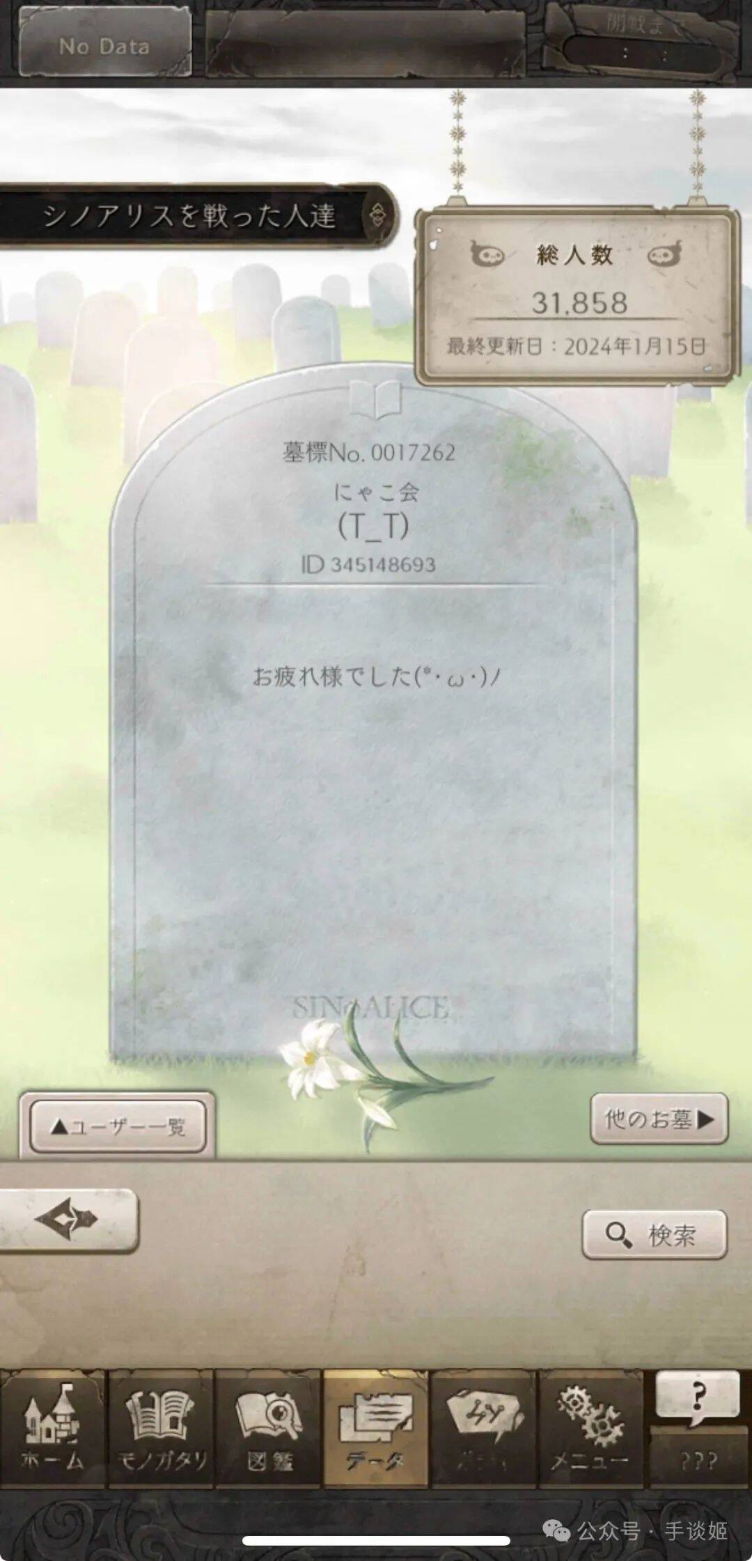 实际上参与结局、撰写墓碑的也不过3万多人,对于一款运营6年之久的游戏来说,应该也算是不错的结局了。同样打着“横尾太郎担任创意总监”旗号,2023年世嘉推出的《错误游戏404》上线不到1年就宣布关服,与之相比,一款2017年推出的游戏在6年后迎来终结,这样的结局应该称得上是的体面了。