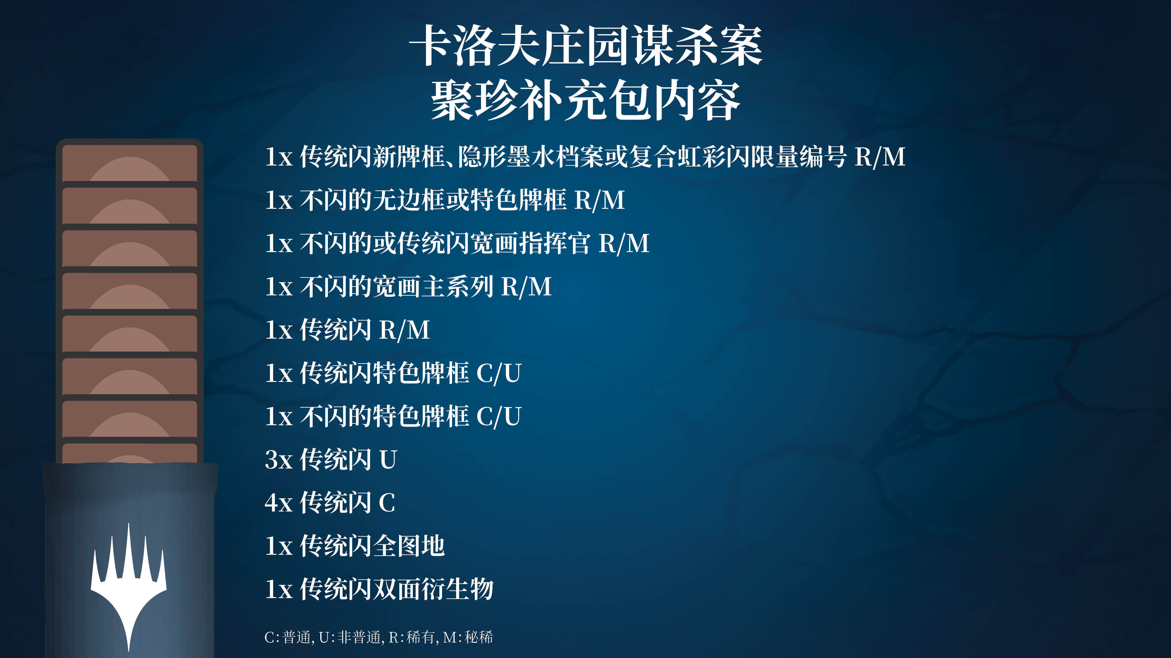 - 卡洛夫庄园谋杀案系列有4副新指挥官套牌,每副含2张秘稀牌。这8张牌除每副指挥官套牌含的2张传统闪版本外,可以通过聚珍补充包在这个位置开到不闪的版本(8.93%)或传统闪版本(8.5%)。