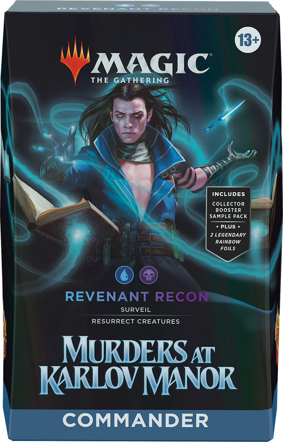 在指挥官游戏中,四位牌手聚在一起展示自身实力并制定策略,最终会有一名牌手获得胜利。每副卡洛夫庄园谋杀案指挥官套牌内含100张牌且开盒即玩,指挥官爱好者以及所有万智牌牌手在您的店里购买一副套牌就能直接加入游戏。和其他卡洛夫庄园谋杀案产品一样,指挥官套牌中也藏着RavnicaDetectiveAgency.com上13道谜题之一的线索!