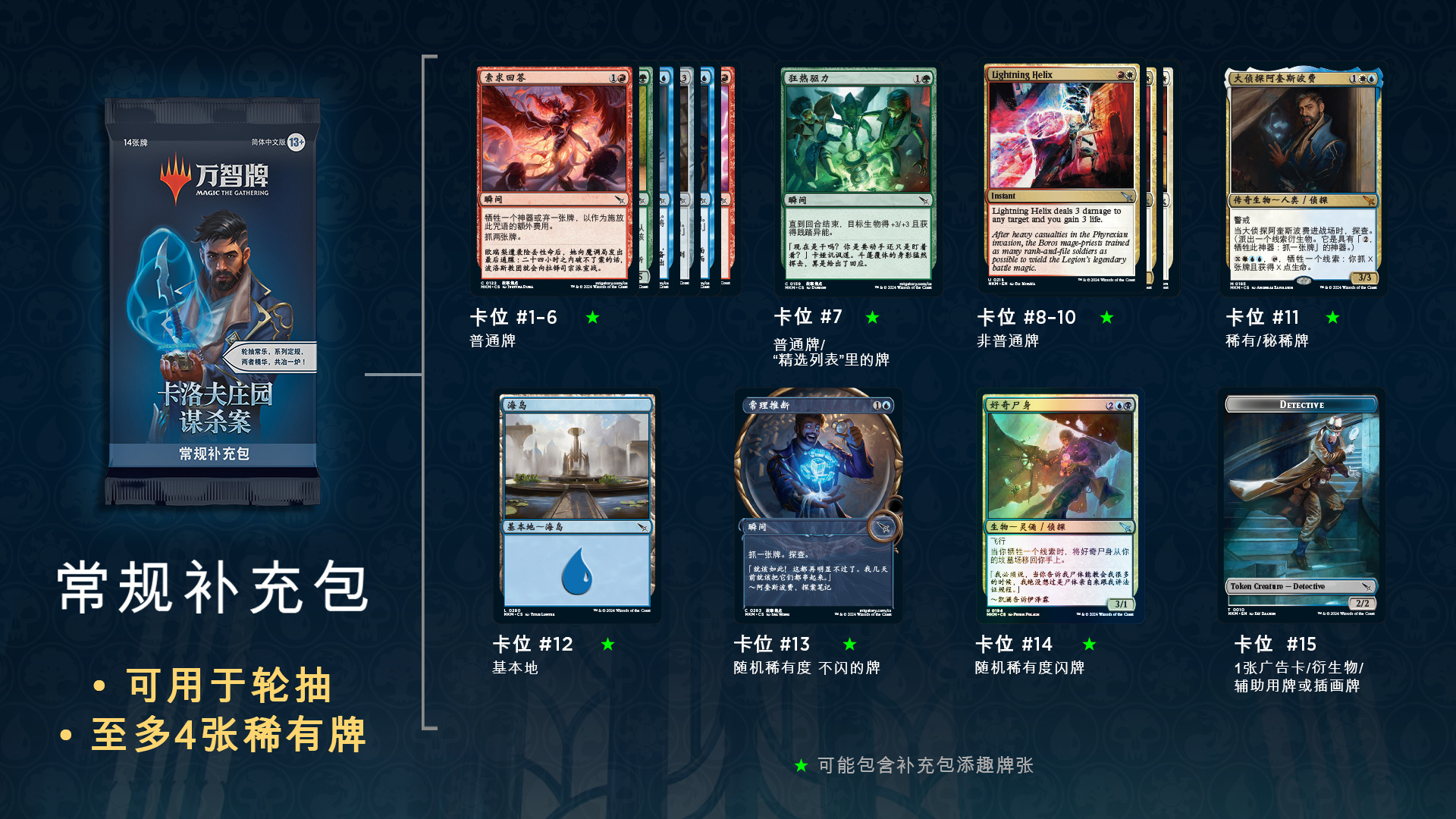 - 精选列表包含30张重印的普通牌和非普通牌,在9.38%的常规补充包中取代1张卡洛夫庄园谋杀案普通牌;或10张稀有牌和秘稀牌,在1.56%的常规补充包中取代1张卡洛夫庄园谋杀案普通牌。