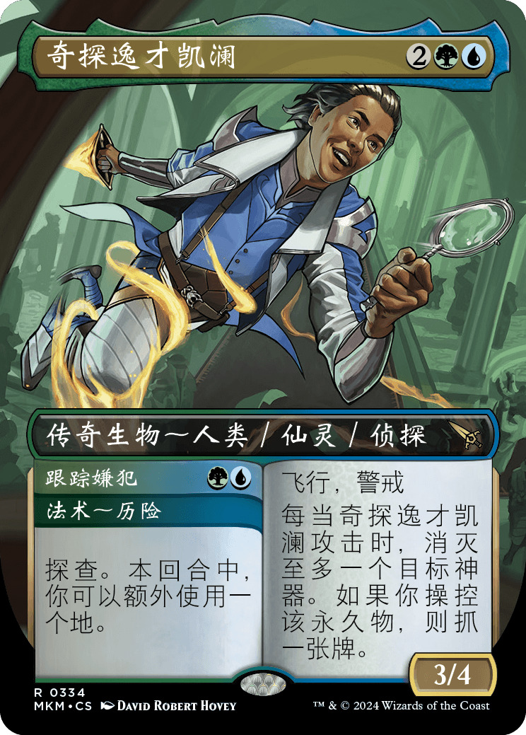 无边框牌张随卡洛夫庄园谋杀案系列回归,精美一如既往。本系列中的无边框牌张包含10张稀有双色地牌、稀有牌奇探逸才凯澜和秘稀鹏洛客牌灵魂判官卡娅。这些牌在常规补充包和聚珍补充包均可开出。
