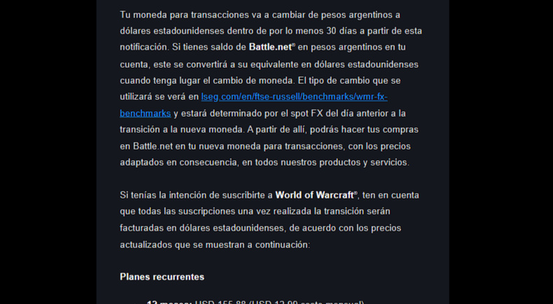 新的一周周二,平衡补丁仍还没有消息,倒是炉石的精神阿根廷人今晨又迎来一个坏消息。受阿根廷激进经济改革的进一步影响,在阿根廷全面美元化的背景下,暴雪商城的阿区物价也将迎来更质变的变化——在30天后,阿区即将彻底以美元计价。不出意外的话,这意味着阿区的比索动荡将结束,而代价是一跃变为高价区。已经有不少阿区玩家收到了邮件通知。