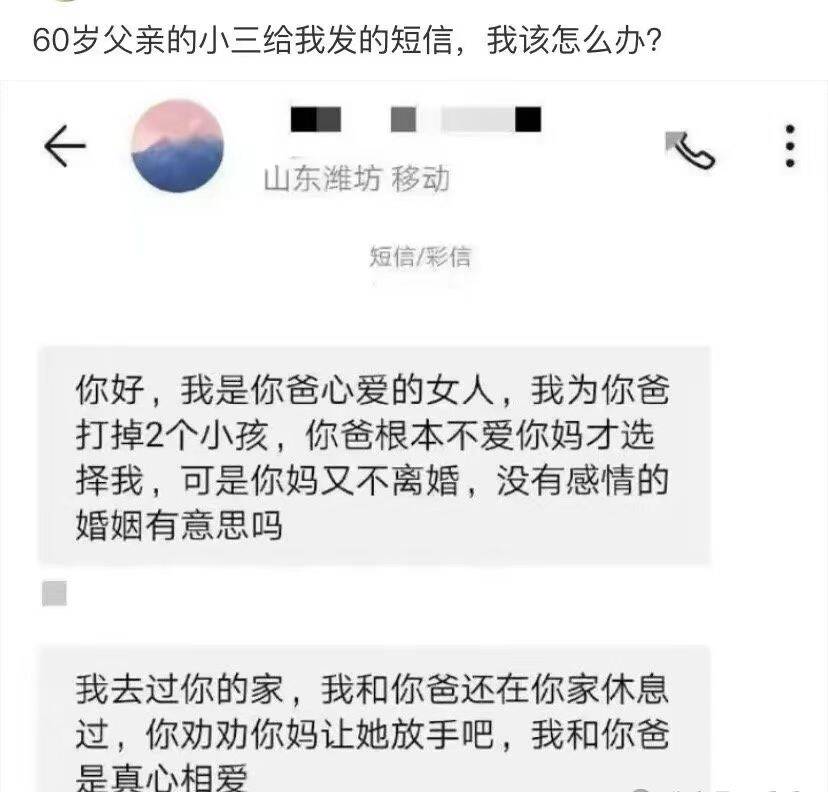 但是转念一想,很不好。因为我默认小三应该是年轻漂亮的,首先这是对母亲的不尊重,我认为母亲是缺乏年轻貌美才让人有机可趁,我变相怪罪了母亲,并且在默认小三存在的合理性。可是有错的人是父亲,无论对方什么年岁什么样貌什么条件,他都不应该出轨。