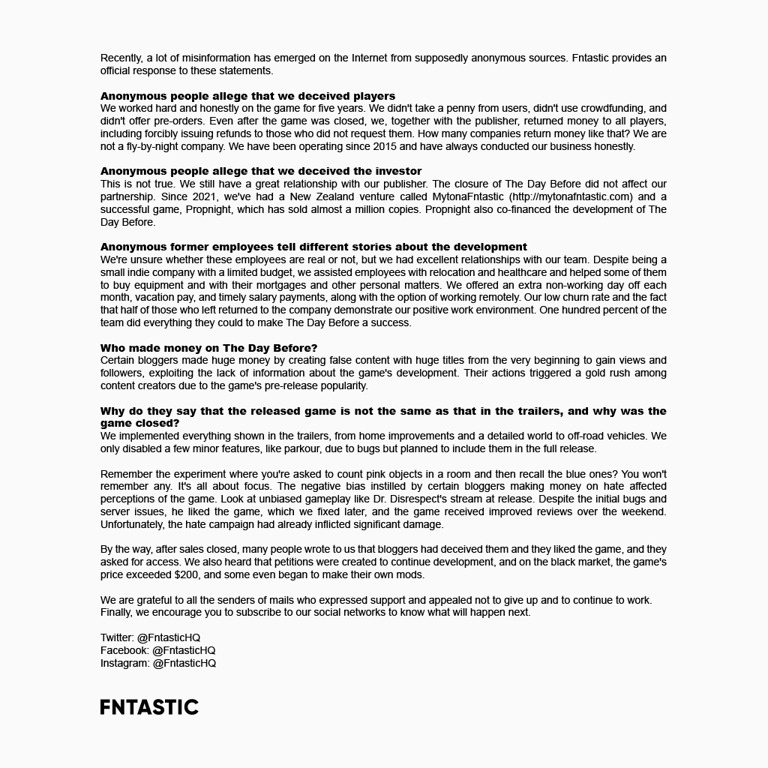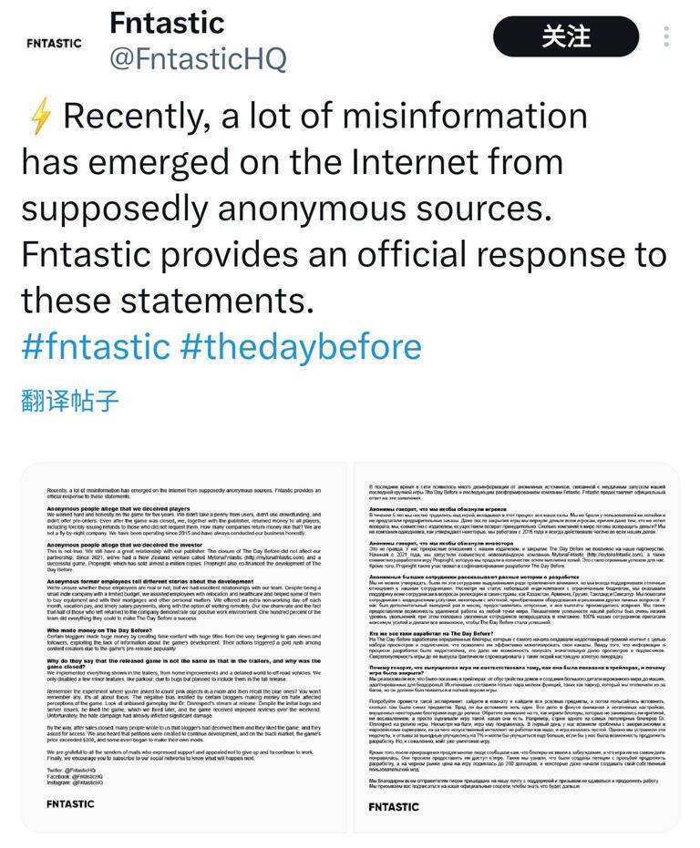 就在不久前,《浩劫前夕》游戏开发商 Fntastic 在 X 平台发文,回应了之前的“跑路”传闻。