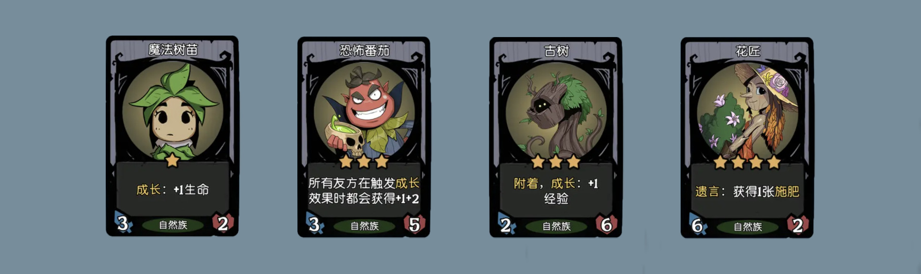 「恐怖番茄」效果从+1+1变为+1+2,“成长”流的“成长”触发频率之高,属性只是多加1血,整体可以叠到相当恐怖的血量。