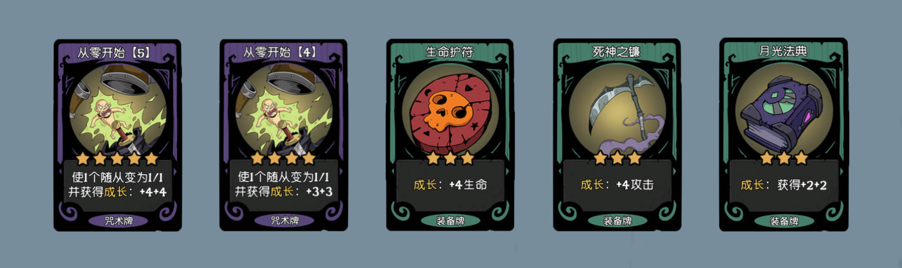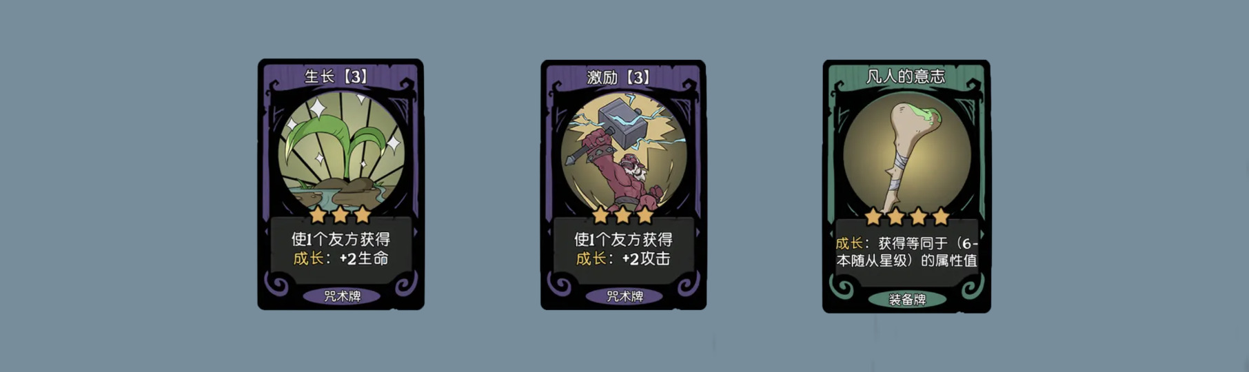 接着,是新增的“成长”相关咒术和装备,其实这两张咒术也不算新增,是从2星调为了3星,数值也提升了1点。是因为卡牌名称变化了,所以操作变为了删除旧卡,增加新卡。