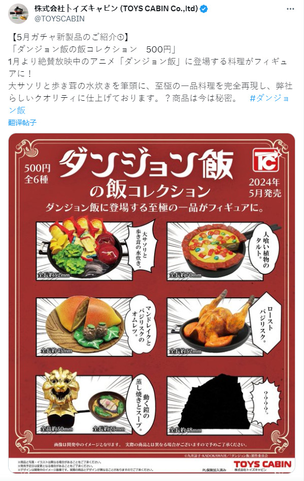 近日日本玩具公司TOYS CABIN Co.在其官方推特账户上宣布,将为《迷宫饭》打造六款动画中出现的美食模型,并将以主题扭蛋的形式发售,单个售价500日元。