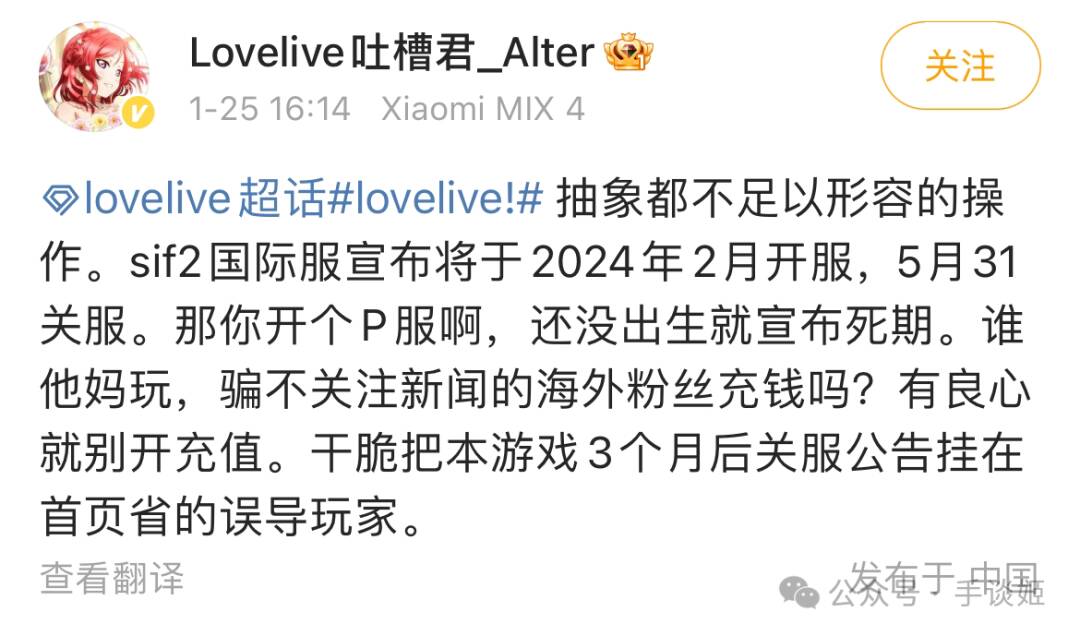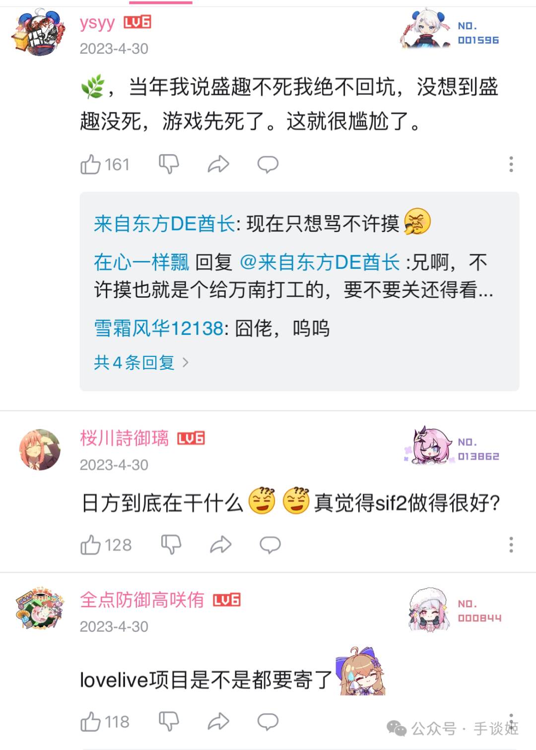 这款游戏同样于2023年年初停服,普遍认为也是给《sif2》让路,引导玩家都去玩《sif2》,但是国内没有《sif2》呀,所以也引起了不少拉拉人的不满。