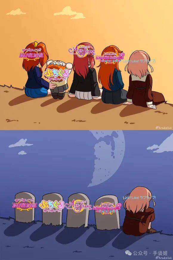 有粉丝制作了下面的梗图,表示目前love live幸存的手游只有《link like lovelive》这款游戏了,姬印象中是一个主打虚拟偶像的企划,但没怎么深入了解过,感觉和其他几部作品的关联也更远一些,但却是目前唯一存活的拉拉手游了。