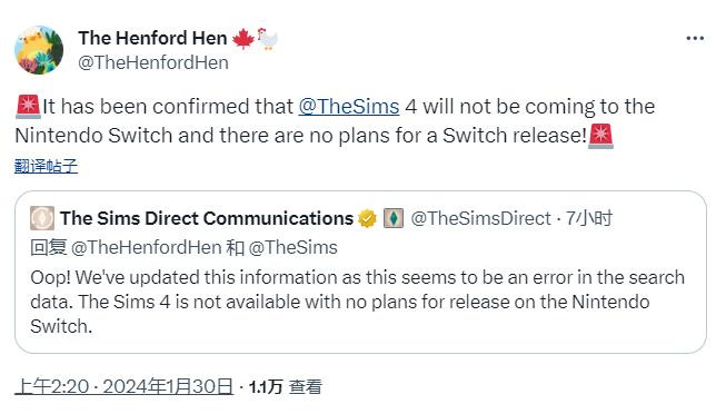 根据“The Sims Direct Communications”的说法,EA页面更新只不过是“搜索数据中的错误”,EA目前没有计划在任天堂Switch上发布《模拟人生4》。