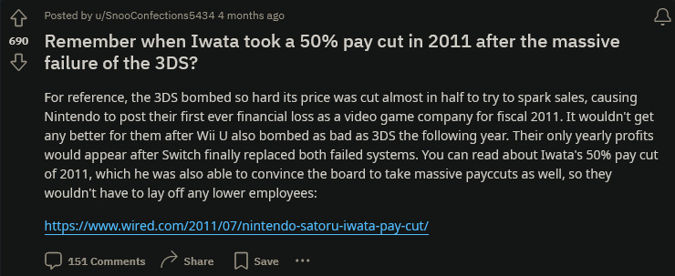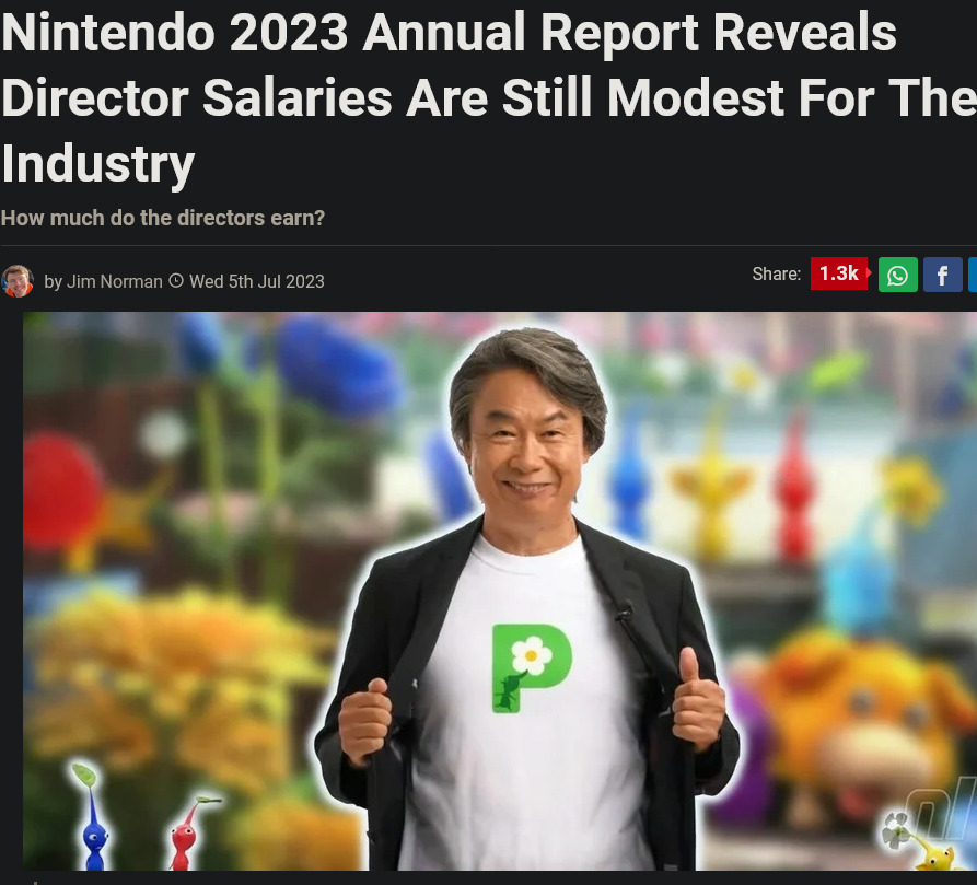 另一位用户引用了 Nintendo Life 关于任天堂 2023 年度财报的报道,表示他的理念已经在公司传承至今,因为时至今日任天堂的高层薪资仍然是行业中相对较低的。