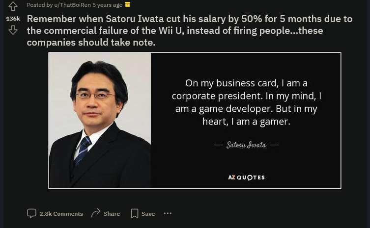在推特上,一位用户分享了他在 2013 年接受采访时发表的一段关于裁员的回应。岩田聪当时说道:“如果我们裁减员工数量来获得短期更好的财政结果,员工的士气会受重创。我真心怀疑那些担心自己可能被解雇的员工是否能够开发出能够给世界各地的人们留下深刻印象的软件产品。”