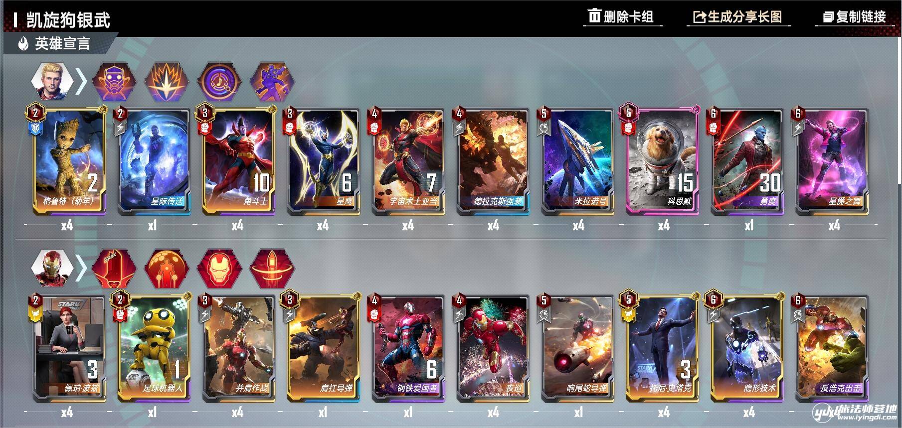 钢铁侠卡组:2费小辣椒带满前期可以多拿钱,2费援军足球人带一张打工;3费并肩作战带满可以让星鹰重复打出0元购的关键道具卡,三费肩扛导弹带一张用来改良4星反浩克装甲;4费爱国者带一张打出直接卖,4费夜巡带满吃鸡的关键道具卡;5费托尼带满打出给钱卖了还能改良,5费响尾蛇一张用来改良4星反浩克;6费隐形带满防止摧毁的关键道具,6费反浩克2-4张均可小洛基、仙宫角色、格斗法等卡组的克星(也可换成铁幕无人机刷银武士身材)。
