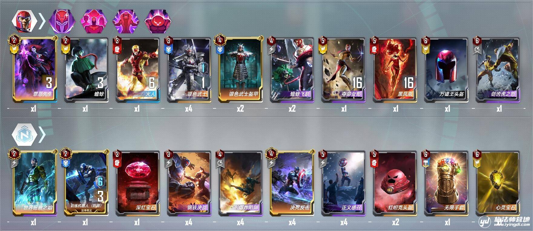 万磁王卡组:2费罪恶先生2费蟾蜍都带一张纯打工;3费火人打工卖了还可以改良,3费银武拉满(最少两张);4费银武盔甲和蟾蜍各两张小树苗和银武一人一张;5费夺命和黑凤凰1-3张用来夜巡;6费两张随便带。